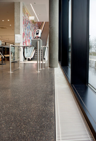 Первый этаж музея футбола совсем не музей: здесь можно попинать мяч! Элегантное небольшое внутреннее пространство определяет род занятий. А чтобы климат оставался оптимальным, несмотря на спортивные занятия, пространство обрамлено воздуховодами с щелевыми решетками типа SAL35. Воздуховоды могут устанавливаться в линию любой длины с 1-4 рядами пазов. Благодаря регулируемому эксцентриковому валику направление струи воздуха также может настраиваться. SAL35 также можно встретить и в других частях музея.