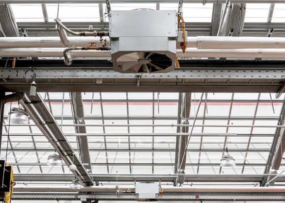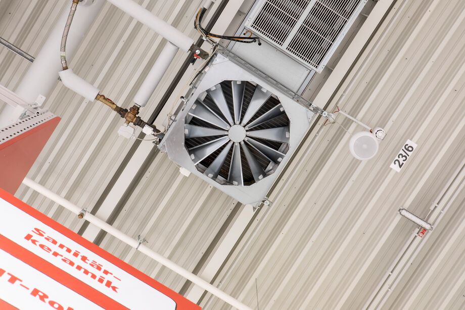 За обогрев широкого павильона отвечают тепловентиляторы ТОР при вторичной обработке воздуха, а также некоторые тепловентиляторы Ultra, везде, где есть подвесной потолок. Семь дверных воздушно-тепловых завес с техникой Tandem защищают входы от доступа холодного воздуха. Кроме того, индивидуально созданный воздухообрабатывающий прибор снабжает управленческий сектор свежим воздухом.