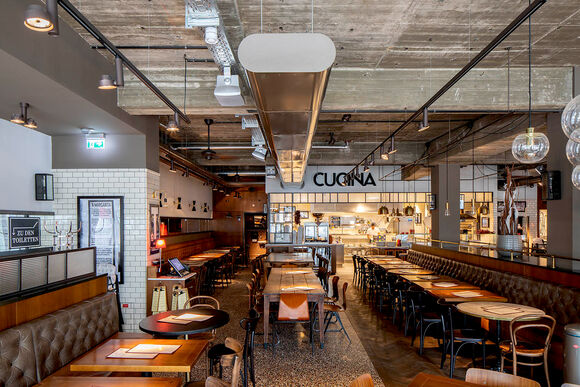 Вентиляция – важный аспект для предприятий общественного питания. В особенности, когда – так же, как в L`Osteria в г. Эрланген – практикуется открытая кухня, то есть еда готовится в кухне, открытой для помещения для гостей. И так как в ресторанах из эстетических соображений часто не вешают потолки, в этом случае предлагаются круглые воздуховоды с решетками от компании Kampmann. Они выполняют не только техническую функцию, но и служат также художественным элементом в интерьере. Однако если потолок не достаточно высокий, для установки системы труб с необходимым диаметром, в этом случае система труб овального сечения ORA является прекрасной альтернативой – так же, как для компании L`Osteria.