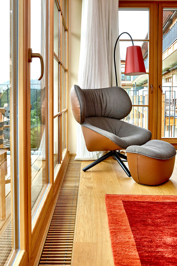 47 люксов и полулюксов, три ресторана, вестибюли, наилучшим образом укомплектованная библиотека, фантастическое спа и не в последнюю очередь идиллическая и огромная панорама горного хребта Веттерштайн, поэтому неслучайно замок Эльмау относится к «Ведущим отелям мира». А для того, чтобы качество воздуха в отеле не уступало свежему альпийскому воздуху, перед большими, достигающими пола оконными фасадами были установлены встраиваемые в пол конвекторы Katherm.