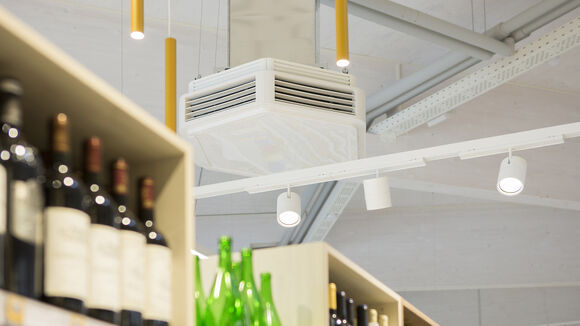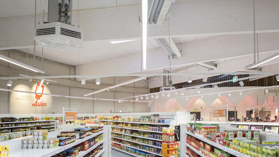 Роль рециркуляционных приборов внутри помещений выполняют потолочные приборы Ultra: настоящая классика от Kampmann для эксклюзивных больших помещений, каковым несомненно является магазин aktiv & irma. Потолочные излучающие панели Galaxis дополняют концепцию в торговых залах, в то время как в складских помещениях свою функцию выполняют солидные, чрезвычайно эффективные тепловентиляторы TOP. Наконец есть еще и крышные вентиляторы Diafort, которые отвечают за вентиляцию склада по сигналу от вентиляционной установки.